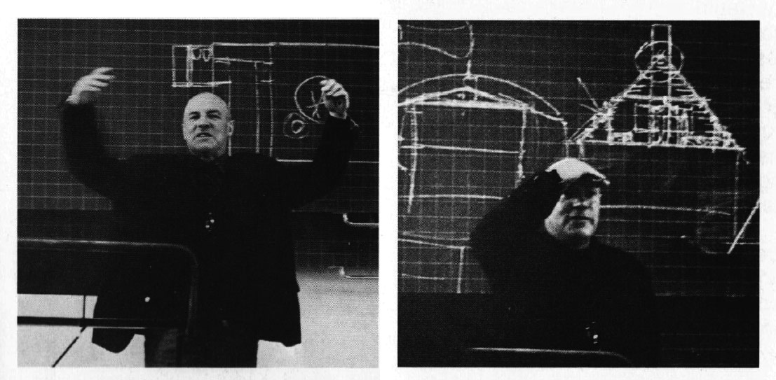 Kuten jo mainitsin, Egon Eiermann oli loistava piirtäjä kummallakin kädellään. Hän oli myös vakuuttava ja innostava esiintyjä. Luennon aikana syntyi suurelle, seinän mittaiselle mustalle liitutaululle monta erilaista kuvakertomusta rakentamisen ja arkkitehtuurin saavutuksista ja vaikeuksista sekä niiden ratkaisuista. Näin vuosikymmenten päästä minulla on jonkin verran huono omatunto siitä, etten älynnyt dokumentoida kameralla noita Eiermannin suurenmoisia, liitutaululle piirrettyjä tarinoita.