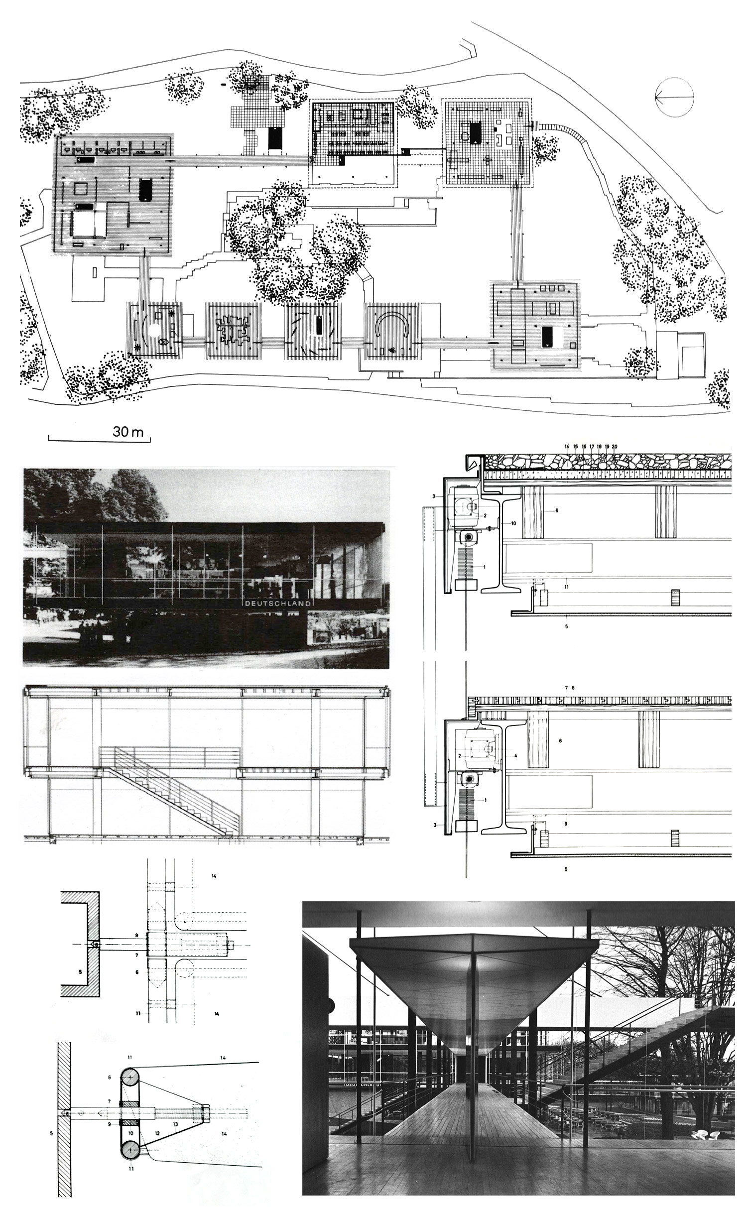 Brysselissä suunnittelijat Eiermann ja Ruf saivat käyttöönsä maisemallisesti viehättävän, puistomaisen alueen vanhoine puineen. Erillisten ennakkosuunnitelmien jälkeen päätettiin työnjaosta. Sepp Ruf vastasi kaupunkisuunnittelun kokonaisilmeestä ja Egon Eiermann paviljonki- rakennusten suunnittelusta yksityiskohtineen ja myös kalustuksesta.