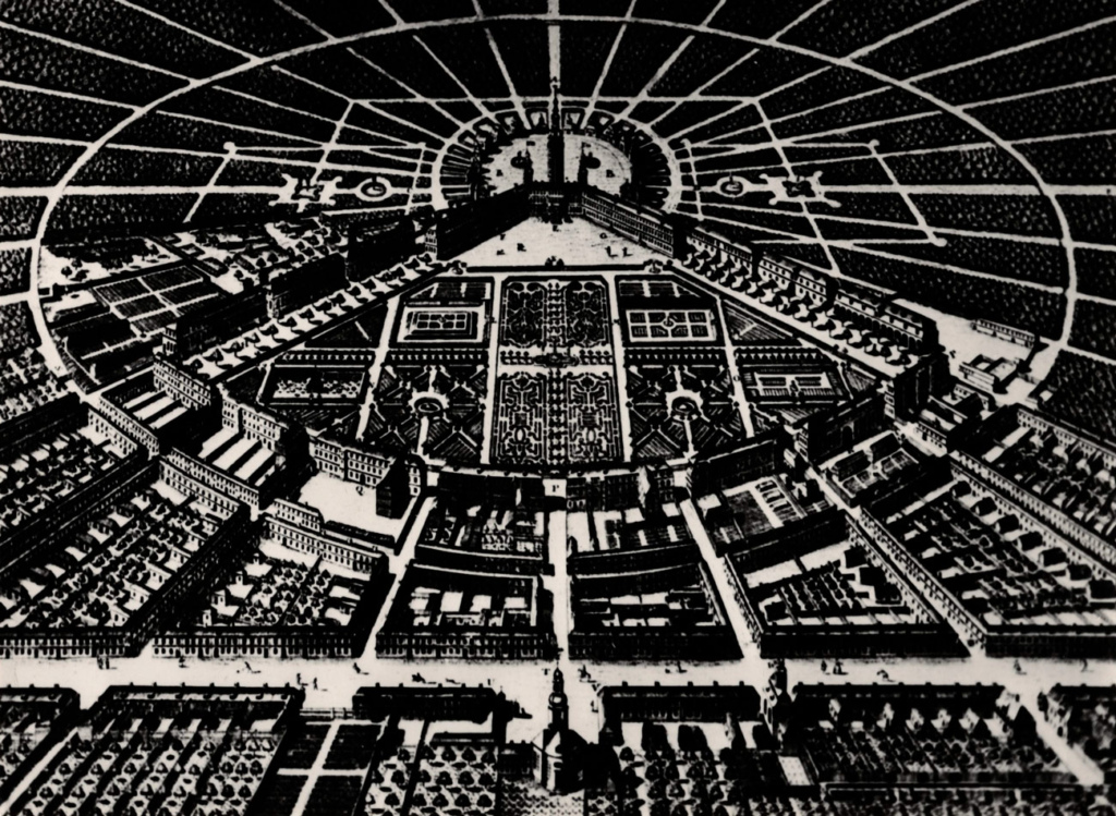 Nyt Karslruheen, jossa Eiermannin ja minunkin tieni kohtasivat. Seuraava kuva näyttää kaupungin perusrakenteen: Säteittäiset vyöhykekaistat, joiden keskipisteenä on linna. Baden-Durlachin maakreivi perusti tämän barokin ajan ideaalikaupungin ”Planstadt Karlsruhen” vuonna 1715. Kaupungin perusrakenne on säilynyt sellaisenaan.