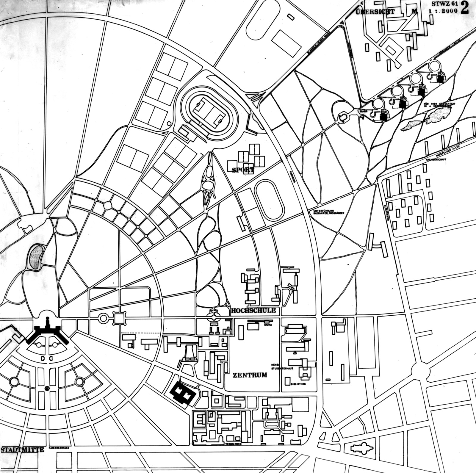 Seuraavaan karttaan on lisätty diplomityöni “Opiskelijakeskus” (“Studentenzentrum”). Se esitti yhden tavan lieventää opiskelijoiden asuntopulaa. Keskukselle liityntäympyröineen löytyi hyvä paikka säteittäisen barokkikaupungin koillisesta sektorista. Karlsruhen linna ja arkkitehtuurikoulu näkyvät kartassa mustalla.